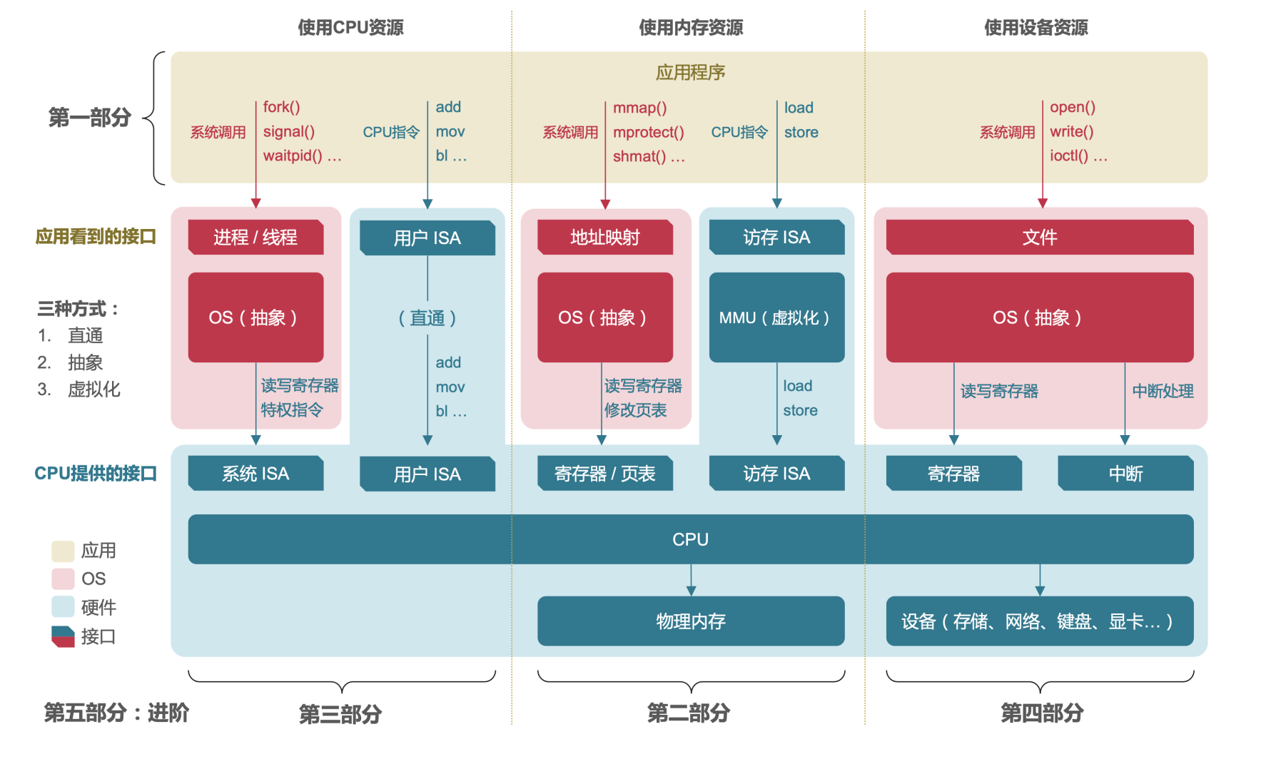 - 为应用提供计算资源的抽象:进程与线程、虚拟内存、I/O 设备抽象为文件