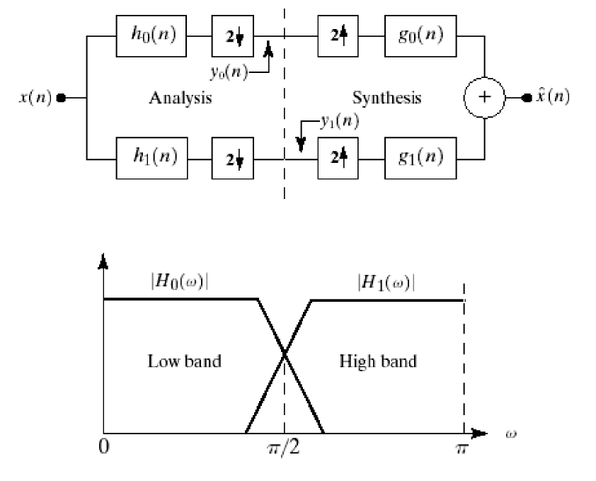 滤波器与小波的关系: 在这个统一的框架中,子带编码中的高通滤波器 和低通滤波器 之间存在着精确的数学关系(正交镜像关系),它们共同定义了其背后的小波函数