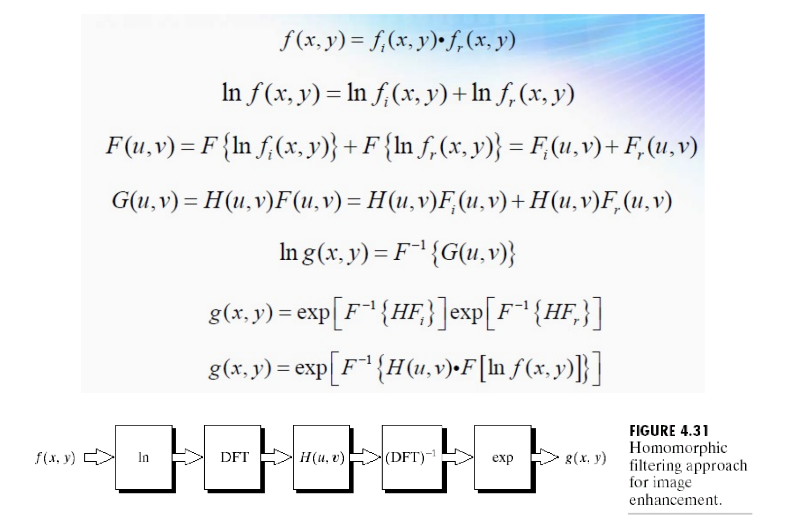 - 处理流程: 取对数 -> 傅立叶变换 -> 滤波(衰减低频并增强高频)-> 反傅立叶变换 -> 取指数