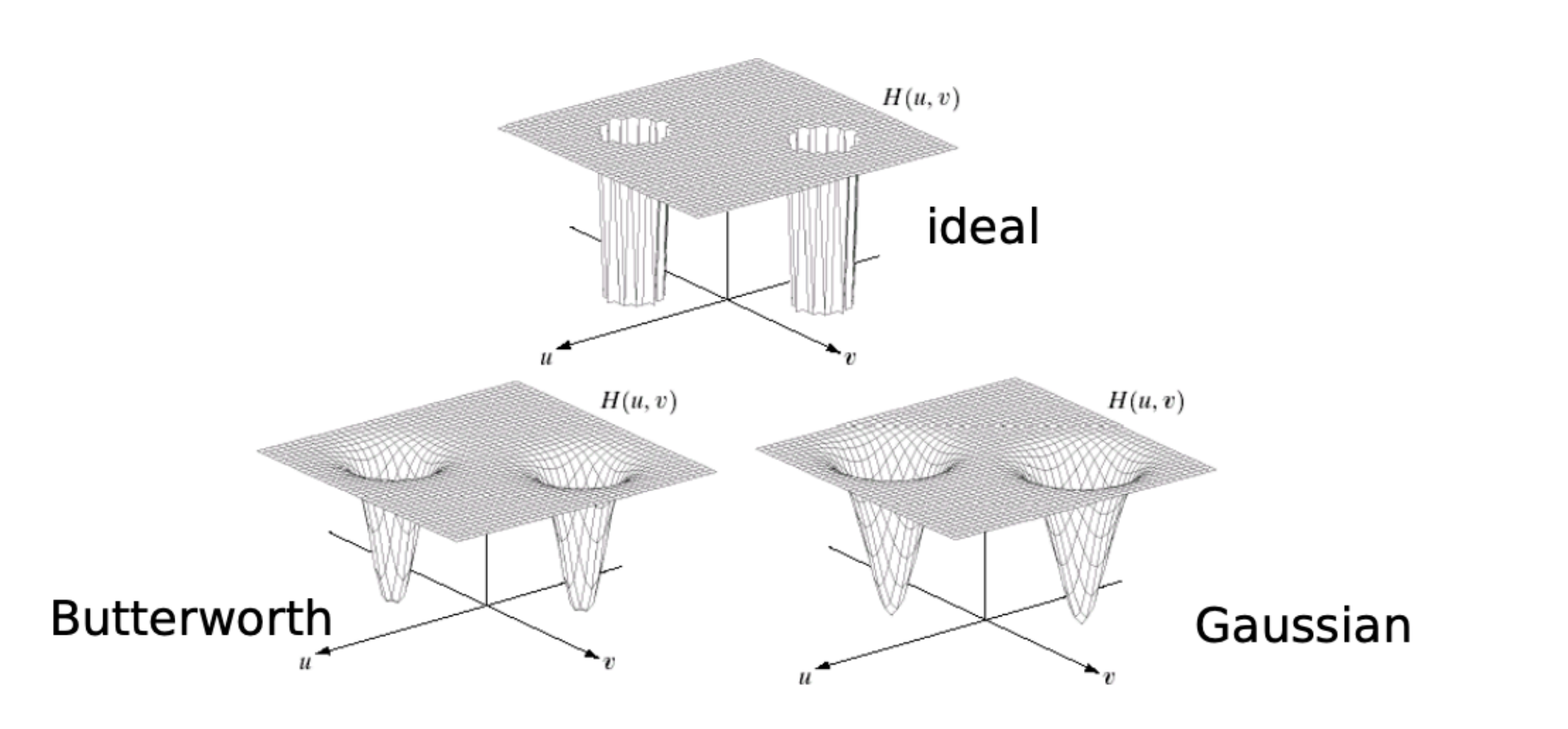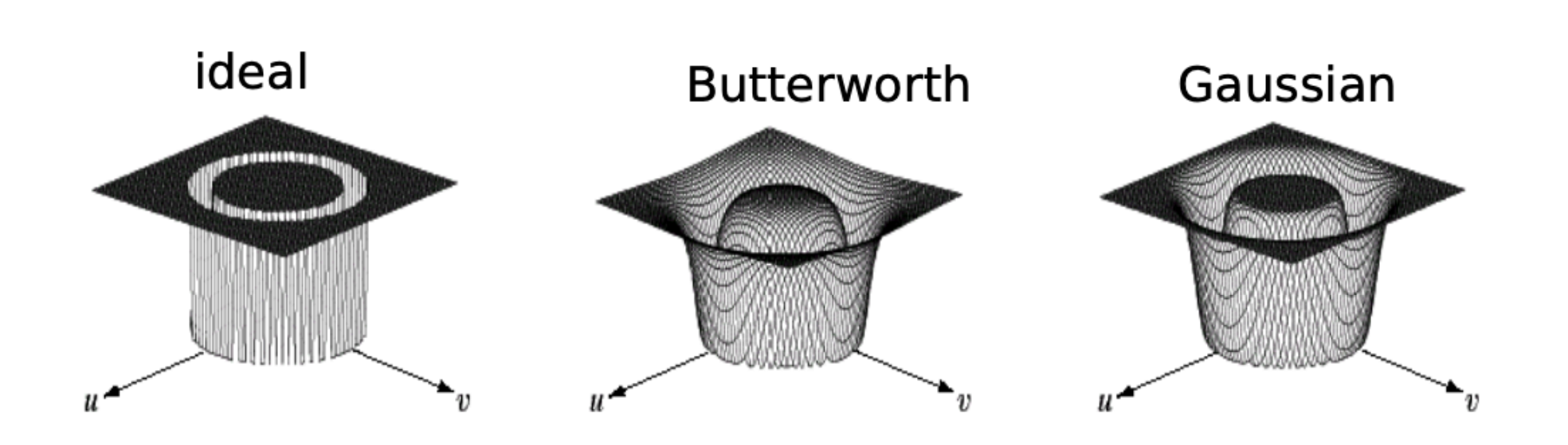 - 如理想、巴特沃斯 (Butterworth) 和高斯 (Gaussian) 三种类型的带阻滤波器,它们可以在以原点为中心的环形区域内抑制频率分量