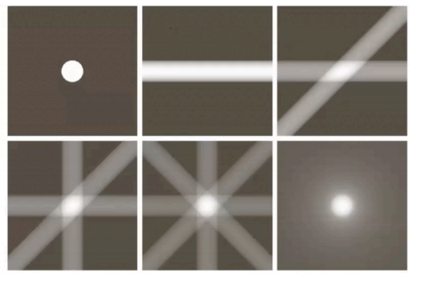 - 多角度累加: 旋转射线源和探测器,获取一个新的投影,并将其反投影结果与之前的图像进行累加
