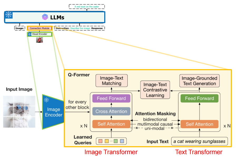 - 连接模块:轻量级的 Q-Former (Querying Transformer)